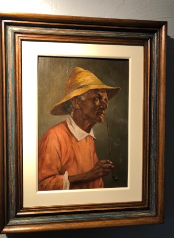 Mulher com cachimbo, chapéu de palha e vestido vermelho