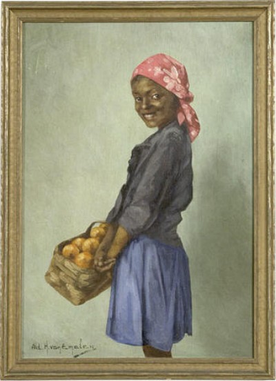 oil on board, signed in the lower left, Ad. H. van Emelen. Fine portrayal of a pretty African American girl with a basket of oranges. In an old gilt frame; 12.5" x 8.5" (w/o frame), 14" x 10.25" (w/frame). > Ex Collection the Mary Kay Walter Family Trust > Condition: Minor surface wear; VG.