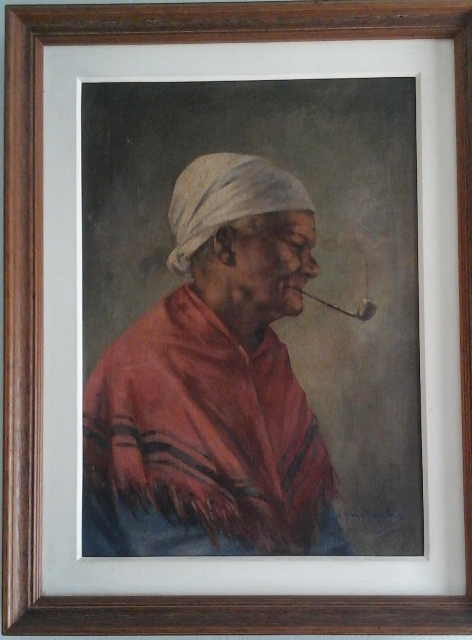 Negra pitando, de chale vermelho e pano branco na cabeça